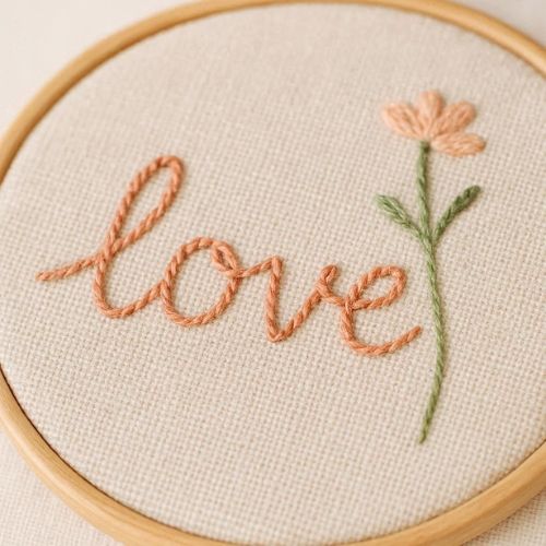 Dans mon atelier de Suresnes, je vous transmets les bases de la broderie à travers un projet créatif et personnalisé : broder votre mot, prénom ou initiales en lettrage cursive sur toile de lin.